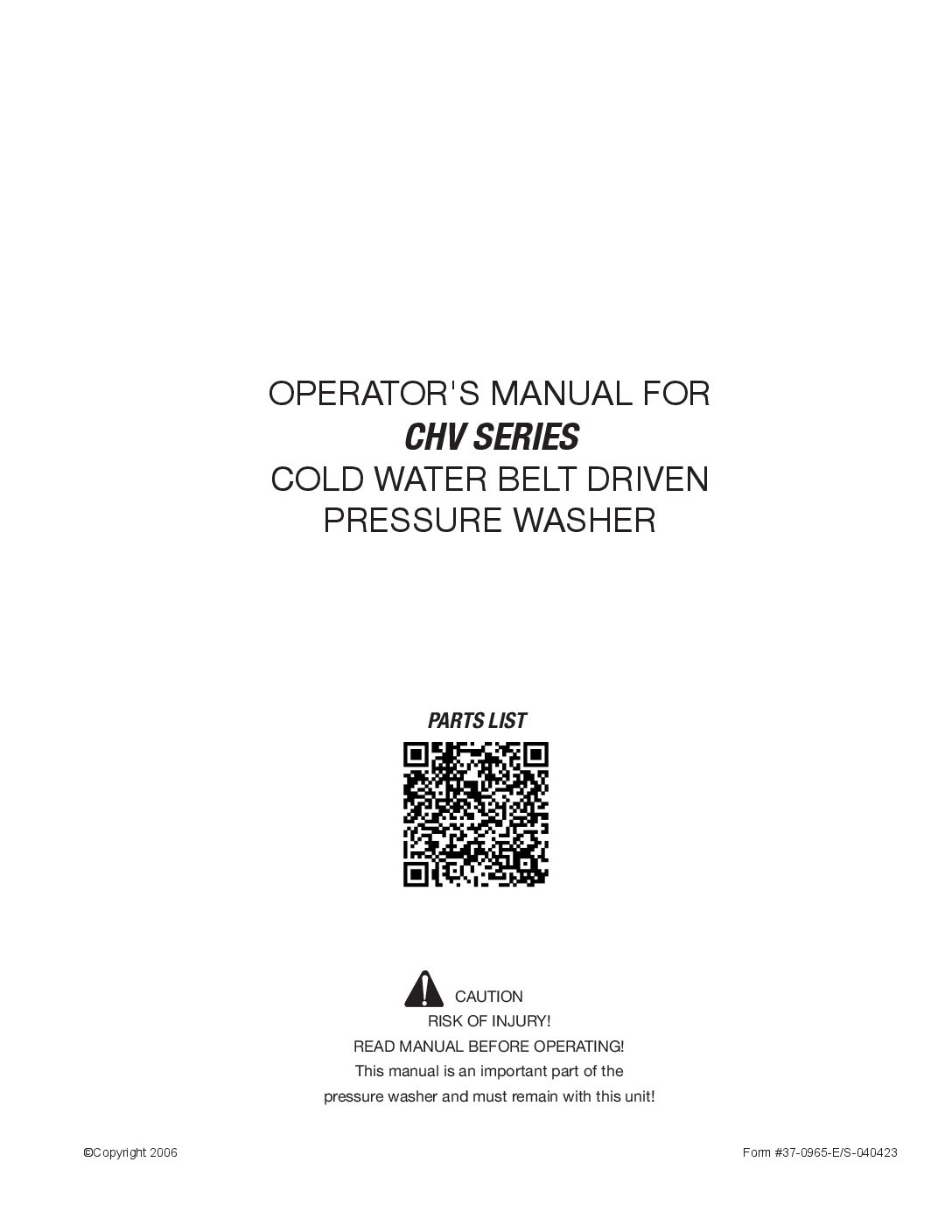 | CHV-0525-1ME1 | Cold water stationary electric belt driven pressure washer | 25 @ 500 | 10.0 HP, 230V, 1Ø, 41.5A |